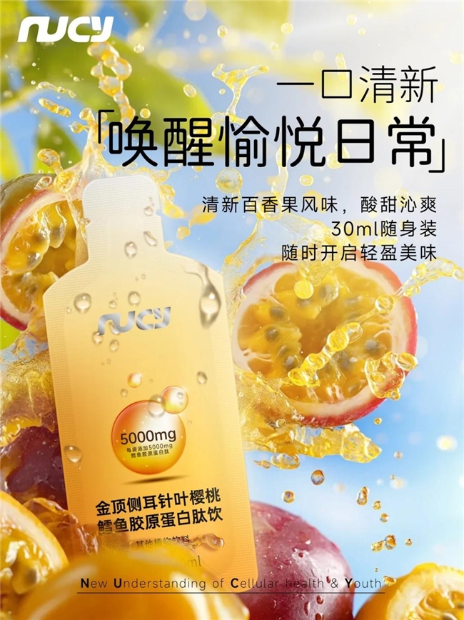 如果想在日常里增加一点悦己小仪式,NUCY针叶樱桃胶原蛋白肽饮不能错过。它的风味特别讨喜,清新的百香果味,酸甜沁爽,带来很棒的味觉体验,冷藏后饮用更是冰润清爽,带来清爽的味觉体验。在原料上,它严选法国鲣鱼弹性蛋白肽和深海鳕鱼胶原蛋白肽,品质清晰可溯,还复配了巴西针叶樱桃粉与日本金顶侧耳浓缩粉,汇聚全球优质营养。更方便的是,它采用30ml随身装设计,轻巧不占地,放进手袋里就能随时取用,0脂肪的配方也让我们享受美味的同时没有负担。这款饮品带来的不只是营养补给,更是一种恰到好处的生活态度,提醒我们在忙碌中也要温柔关注自己。